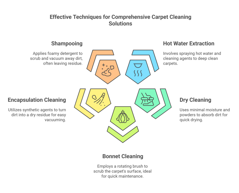Carpet shampooing involves applying a foamy detergent, scrubbing it into the carpet, and then vacuuming away the dirt. While effective, this method often leaves a residue that requires additional rinsing. -