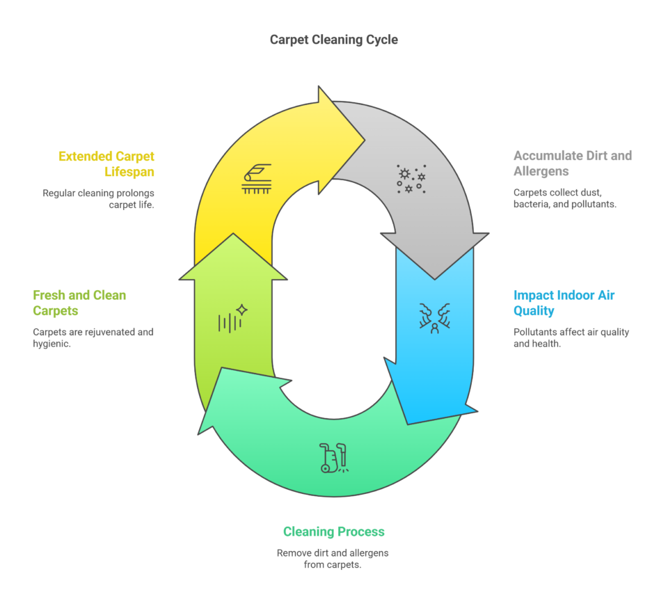 Carpet cleaning removes dirt, allergens, and stains from carpets to maintain their appearance and hygiene. Over time, carpets collect dust, bacteria, and other pollutants that can affect indoor air quality and cause health issues. Regular cleaning extends the lifespan of carpets and keeps indoor spaces fresh and clean.